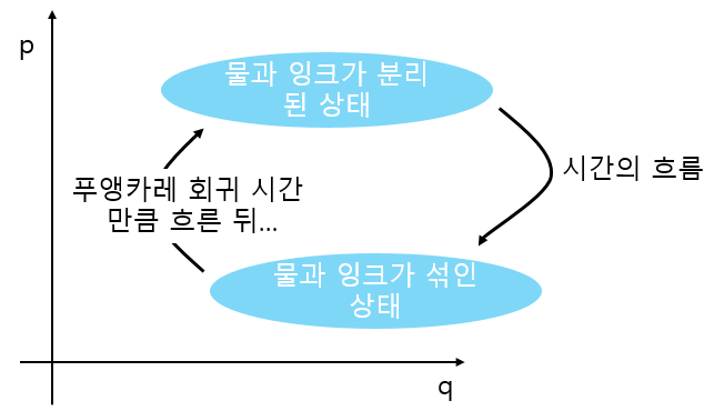 운동 정식에 의해서 위상 공간의 영역은 계속 해서 움직이며, 멈춰 있을 수 없습니다. 따라서 위 예시에서 계속 해서 흘러가는 물과 같이 계속해서 움직일 수 밖에 없습니다. 위상 공간의 영역이 시간이 지남에 따라서 훑고가는 영역은 계속 해서 커지기 때문에, 언젠가는 이전에 훑고 지나갔던 영역을 다시 지날 수 밖에 없습니다. 이는 곧, 과거의 어떤 시점의 시스템의 상태와 거의 동일한 상태로 시스템이 옮겨진다는 것 입니다! 이 과정에 걸린 시간을 푸앵카레 재귀시간이라고 합니다.