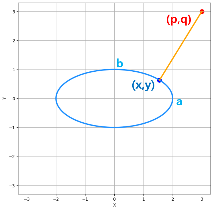 우리 문제는 $d(\vec{x}) = |\vec{x} - \vec{p}|$를 최소화하는 타원 위의 점 $\vec{x}$를 찾는 것 입니다. 좀 더 명확하게 수학적으로 표현하면,
