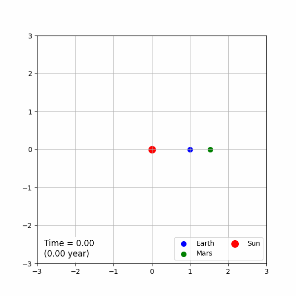 식을 최대한 간단히 하였으니, 이를 바탕으로 운동 방정식을 풀어서 태양계 행성들이 태양 주변을 공전하는 시뮬레이션을 해 보도록 하겠습니다. 한 번에 모든 행성의 움직임을 보면 조금 복잡하고 귀찮으니, 대표적으로 태양, 지구, 화성으로 이루어진 시스템만 고려하도록 하겠습니다. 태양의 질량은 지구와 화성의 질량에 비해서 훨씬 크기 때문에, 편의상 태양의 중심과, 전체 시스템의 질량 중심이 같다고 보도록 하겠습니다. 태양은 원점에 있고, 지구와 화성은 X축의 한 점에서 Y축 방향의 초속도를 갖는 등속 원운동을 한다고 가정하겠습니다. 태양-화성의 거리는 태양-지구의 거리의 약 1.523배 입니다. 우리 문제의 단위계를 활용하여 지구와 화성의 운동의 초기 위치와 속도를 표현하면