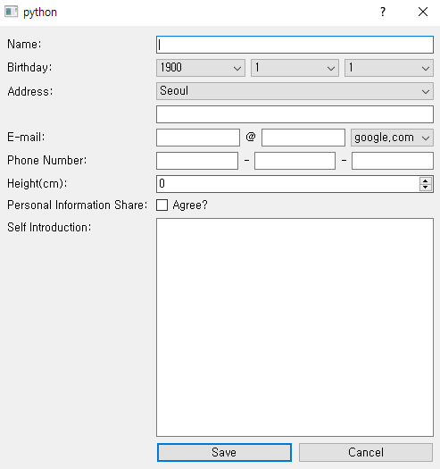 위 코드는 이름 정보를 입력하기 위해 "Name :" 이라는 라벨과 QLineEdit 위젯 필드를 추가한 것 입니다. 위 예시 코드에서는 다양한 위젯을 이용했는데요, 원하는 대로 위젯을 만들고 위 과정을 반복하기만 하면 됩니다.