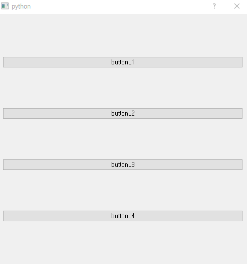 4개의 PushButton으로 이루어진 간단한 UI입니다. 위젯을 대표해서 QPushButton을 활용한 것이니 목적에 따라서 다양한 종류의 위젯이 있다고 생각하면 됩니다. 만일 위 두 버튼(button_1, button_2)의 활용 목적과 아래 두 버튼(button_3 button_4)의 활용 목적이 다르다고 하겠습니다. 이 경우 두 button_1, button_2를 하나의 그룹으로, button_3, button_4를 다른 그룹으로 생각하고 두 그룹간의 눈에 띄는 분리를 준다면 UI의 직관성과 심미성이 향상될 것 입니다. 이 경우 QGroupBox를 활용하여 button_1, button_2를 묶는 경계선을 만들고, button_3, button_4를 묶는 경계선을 만들면 될 것 입니다.