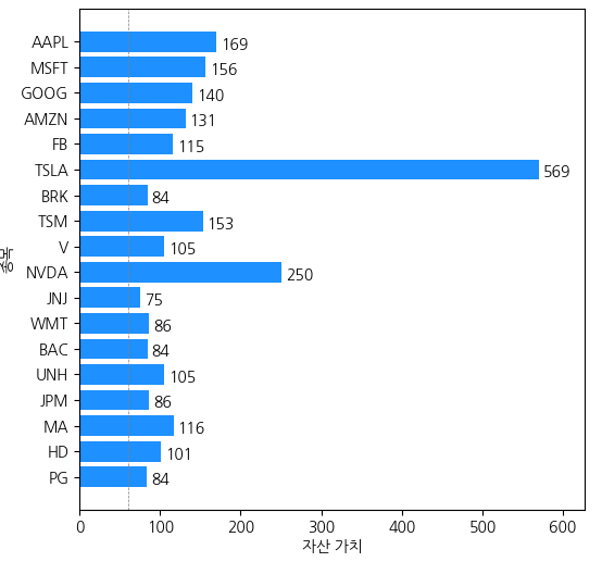 애플AAPL, 마이크로소프트MSFT, 구글GOOG, 아마존AMZN, 페이스북FB, 테슬라TSLA, 버크셔해서웨이BRK, TSMCTSM, 비자V, 엔비디아NVDA, 존슨앤존슨JNJ, 월마트WMT, 뱅크오브아메리카BAC, 유나이티드핼스그룹UNH, 제이피모건JPM, 마스터카드MA, 홈디포HD, 프록터앤드갬블PG
