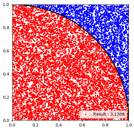 가 됩니다. 즉, 우리가 무작위적으로 한 점을 선택했을 때, 이 점이 붉은색 영역에 속한 점이 될 확률을 정확히 원주율이 $1/4$이 됩니다. 따라서, 만일 우리가 무작위적으로 점을 선택(찍는) 과정을 반복한다면 확률의 큰수 법칙에 따라서 전체 점의 갯수 중에서 빨간색 영영역의 점의 갯수의 비율은 정확히 $\pi/4$가 될 것 입니다. 이를 수식적으로 정확하게 표현하면,