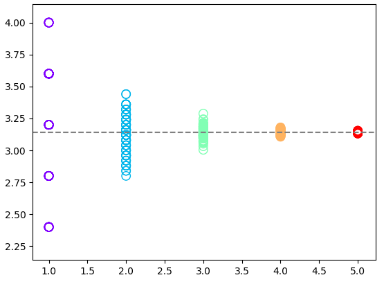 위 그래프는 각 시행횟수 N 마다 100번의 반복된 실험을 한 결과를 보여주고 있습니다. X축은 1, 2, 3, 4, 5 값을 갖는데 각각 시행 횟수 N = 10, 100, 1000, 10000, 10000 를 의미합니다. 10의 거듭 제곱의 값 입니다. Y 축은 각 시행에서 얻어진 원주율 값 입니다.