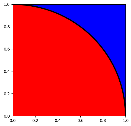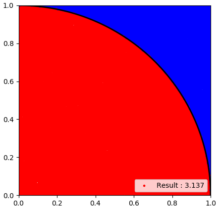 $$\pi/4 = \frac{\text{선택된점이 빨간색 영역에 속하는 횟수}}{\text{무작위적으로 한 점을 고르는 횟수}}$$