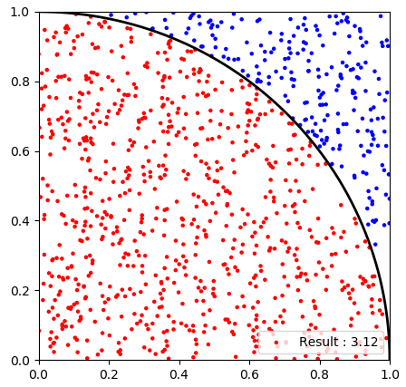 pi = np.sum(in_out)*4/N ### Pi 값은 천제 시행에서 원 안에 있는 점의 갯수로 정해짐