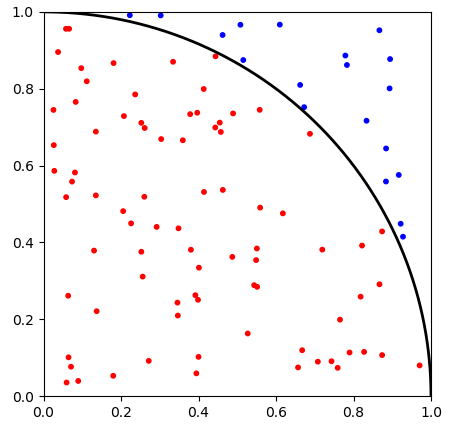 파이썬 프로그래밍을 통해서 위 영역에서 100개의 점을 무작위로 선택했고, 이 점이 원이 내부에 있는경우에는 빨간색으로, 원의 외부에 있는 경우에는 파란색으로 표시하였습니다. 완전히 고르게 퍼져 있는 것은 아니지만, 점들이 나름대로는 넓게 잘 펼쳐져 있는 것 같습니다. 위의 구체적인 예시에서는
