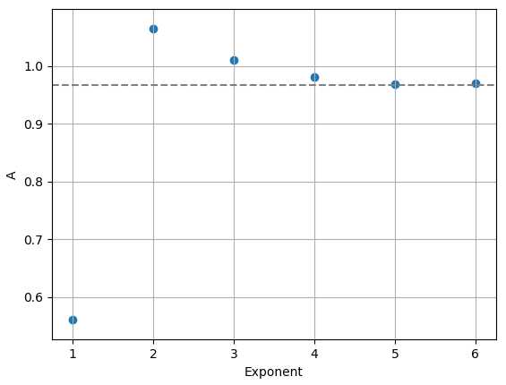 plt.scatter([1, 2, 3, 4, 5, 6], As) ### d에 따른 A값을 그리기