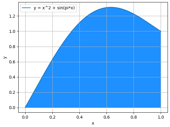 로 둘러쌓인 영역입니다. 간단히 적분식으로 표현하면 $A = \int_{0}^{1} x^2 + \sin(\pi x) dx$ 가 됩니다. 기본적인 다항함수와 삼각함수의 합이기 때문에 해석적으로 적분할 수 있고, 그 답은 $A = \frac{1}{3} + \frac{2}{\pi} = 0.96995$ 가 됩니다.