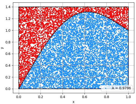 위 전체 프로그램을 실행하면 $N= 4000$번의 샘플링을 통해서 영역 $S$의 넓이 $A$를 구하게 됩니다.
