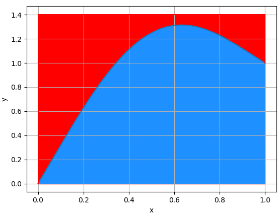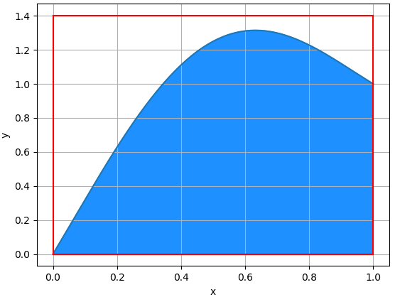위 영역을 포함하는 직사각형을 잡으면 됩니다. 원리적으로는 아무런 모양의 직사각형을 잡아도 되지만, 계산의 효율성을 위해서는 해당 영역을 포함하는 최소 넓이의 직사각형을 선택하는것이 좋습니다. 직사각형의 가로의 길이는 자명하게 1이 되고, 세로의 길이는 $f(x)$의 최대값으로 하면 됩니다. $f(x)$의 최대값을 정확하게 구하기는 어려우니 (사실은 어렵다기 보다는 귀찮으니), 최대값 보다 크면서 적당히 작은 1.4를 세로의 길이로 하도록 하겠습니다. 가로의 길이 $W= 1$, 세로의 길이 $H = 1.4$, 직사각형의 넓이 $R = W H = 1.4$가 됩니다.