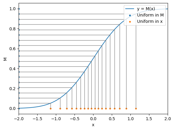 위 그래프의 하늘색 점은 $y=M(x)$위에 $M$ 공간 [0, 1]에서 균등하게 20조각으로 나누고, 각 $M$ 값에 해당되는 점을 그래프 상에서 찍은 것 입니다. 주황색 점은 하늘색 점의 $x$좌표 점이 됩니다. 즉, $M$ 공간에서 균등 분포는 $x$공간에서는 0 근처에 밀도가 높은 분포에 해당합니다. 연속되는 하늘색 점의 $x$좌표의 차이는 $y = M(x)$그래프의 기울기에 반비례 하게 되므로, 연속되는 주황색 점의 값의 차이는 $\frac{1}{M'(x)}$에 비례합니다. 연속적인 두 점의 거리가 $\frac{1}{M'(x)}$에 비례하게 되면, 점의 분포는 $M'(x)$에 비례함을 알 수 있고, 따라서 $x$의 분포는 $M'(x) = N(x)$값에 비례하게 됩니다.