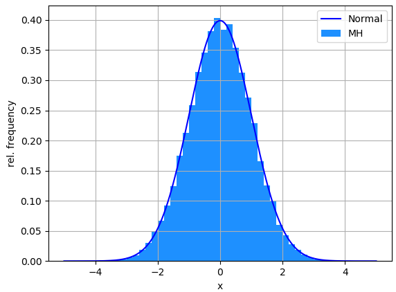 위에서 설명한 메트로폴리스-헤이스팅스 알고리듬은 파이썬 프로그램으로 구현하여 얻은 분포입니다. 히스토그램으로 표현한 것이 시뮬레이션으로 부터 얻은 $\{x_n | i=1, 2, 3, ... K\}$의 빈도를 나타낸 것이고, 파란색 선은 $N(x)$를 나타냅니다. 총 반복횟수 $K$는 $10^5$번 입니다. 히스토그램과 해석적인 커브가 거의 일치함을 확인할 수 있습니다.