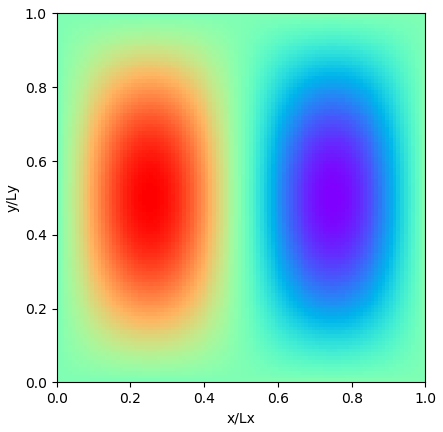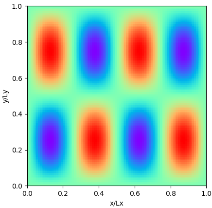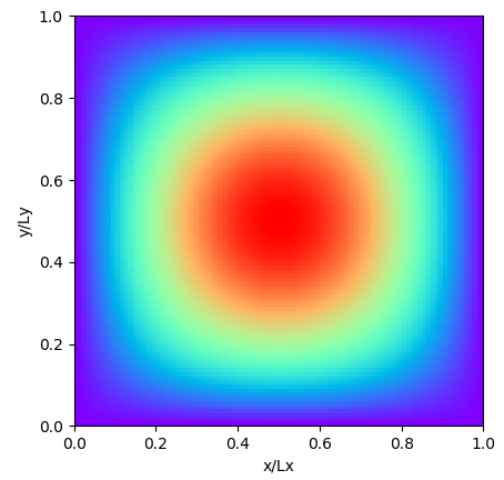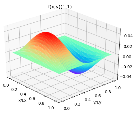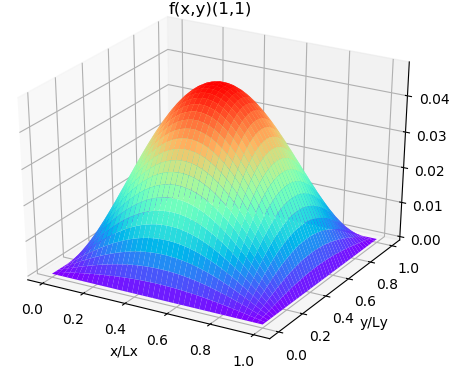 위 그래프는 $(n_x, n_y) = (1,1)$ 인 경우의 $f(x,y)_{1, 1}$의 그래프 입니다. 파란색이 0, 붉은색이 1값을 나타냅니다. 중앙이 불룩하게 솟아 있고, 경계면은 경계조건 때문에 0의 값을 갖습니다.