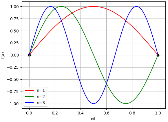 가 됩니다. 양의 정수라는 제한이 있는 $n$ 값 역시 현재 정보만으로는 결정 할 수 없습니다. 따라서, $\frac{\pi}{L}, \frac{\pi}{L}2, \frac{\pi}{L}3, ...$ 과 같이 $\frac{\pi}{L}$의 정수배가 된다면 위 미분 방정식과 경계조건을 만족하게 됩니다. $k$를 $k_n = \frac{\pi}{L}n$으로 놓을 수 있습니다.
