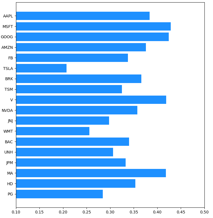평균 상관 계쑤가 가장 작은 종목은 테슬라 입니다. 위 계산에 사용된 기간인 2013년~현재까지 테슬라는 다른 종목 보다 훨씬 더 높은 수익률을 보이며 상승하고 있는데요, 테슬라 혼자 독보적인 상승세로 등락을 하였기 때문에 다른 종목들과는 관련성이 작았습니다. 즉, 세계의 경기가 좋아서 혹은 주식 시장이 전반적으로 좋아서 해당 종목이 상승했다기 보다는 그냥 해당 종목"만" 우수한 성과를 내서 주가가 많이 상승한 것 입니다. 같은 섹터에 있는 다른 종목들과 동반 성장을 한 것이 아니라 혼자만 잘 나갔기에, 어쩌면 위험을 내포하고 있다고도 평가 할 수 있습니다.