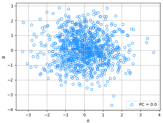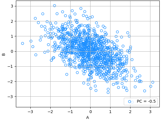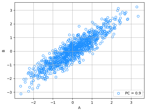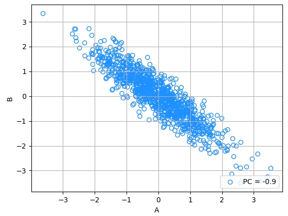 위에서 부터 피어슨 상관 계수(PC)가 0.9, 0.5, 0.0, -0.5, -0.9 를 같은 분포 (A, B)의 그래프 입니다.
