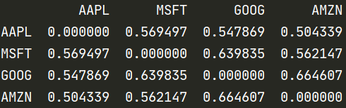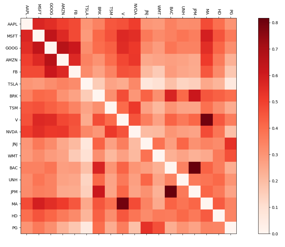 결과는 위 2차원 그래프와 같습니다. 행에 있는 종목과 열에 있는 종목의 피어슨 상관 계수를 오른쪽 스케일바의 색상을 이용하여 색칠한 것 입니다. 진한 빨간색일 수록, 두 종목 사이의 상관 계수가 큰 경우를(가장 큰 값인 진한 붉은색은 상관 계수가 약 0.8 입니다), 흰색에 가까울수록 두 종목 사이의 상관 계수가 0에 가까운것을 뜻 합니다.
