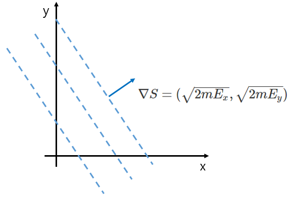 위 $S(x,y)$의 등곡선(isosurface)를 그리면 위 그래프의 하늘색 점선과 같습니다. 해밀턴-야코비 방정식을 통해서 얻은 해는 $S(x,y)$인데, 2차원 상에서는 등고선을 그리면 물리적 의미를 가장 쉽게 파악할 수 있습니다. 운동량은 $\nabla S$로 주어지는데, $\nabla S$의 방향은 $S$의 등고선과 수직이라는 것을 이용하면 위와 같이 $\nabla S = \vec{p} = (p_x, p_y)$의 방향을 쉽게 알 수 있습니다.