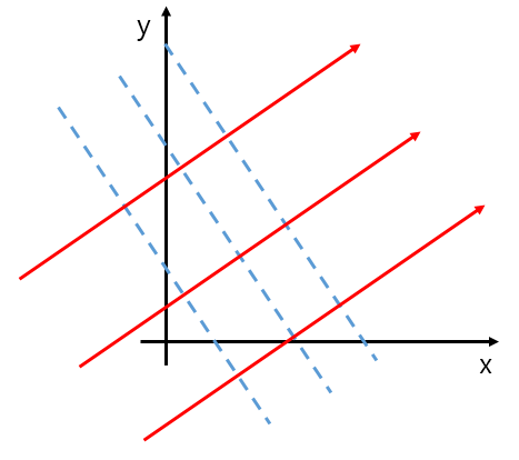 뉴턴 역학(혹은 라그랑주 역학) 에서는 시간에 따른 입자의 위치를 구합니다. 이는 위 그래프에서 빨간색으로 표시한 화살표와 같습니다. 초기 운동량 $(p_x, p_y)$ 주어졌다면, $x(t) = (x, y) = (\frac{p_x}{m}t, \frac{p_y}{m}t) + (x_0, y_0)$의 형태로 주어집니다. 입자의 초기 위치가 주어지지 않는다면, 위 그림에서 처럼 $(p_x, p_y)$ 방향을 가리키고 있는 붉은색 선이 $x(t)$가 될 것 입니다. 위 그림에서는 3개 밖에 그리지 않았지만, $(p_x, p_y)$ 방향의 모든 벡터가 $x(t)$의 후보가 됩니다. 추가적으로 입자의 초기 위치 $(x_0, y_0)$가 주어진다면, 위 많은 해의 후보 중에서 하나의 해가 결정이 되게 됩니다.