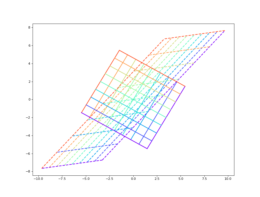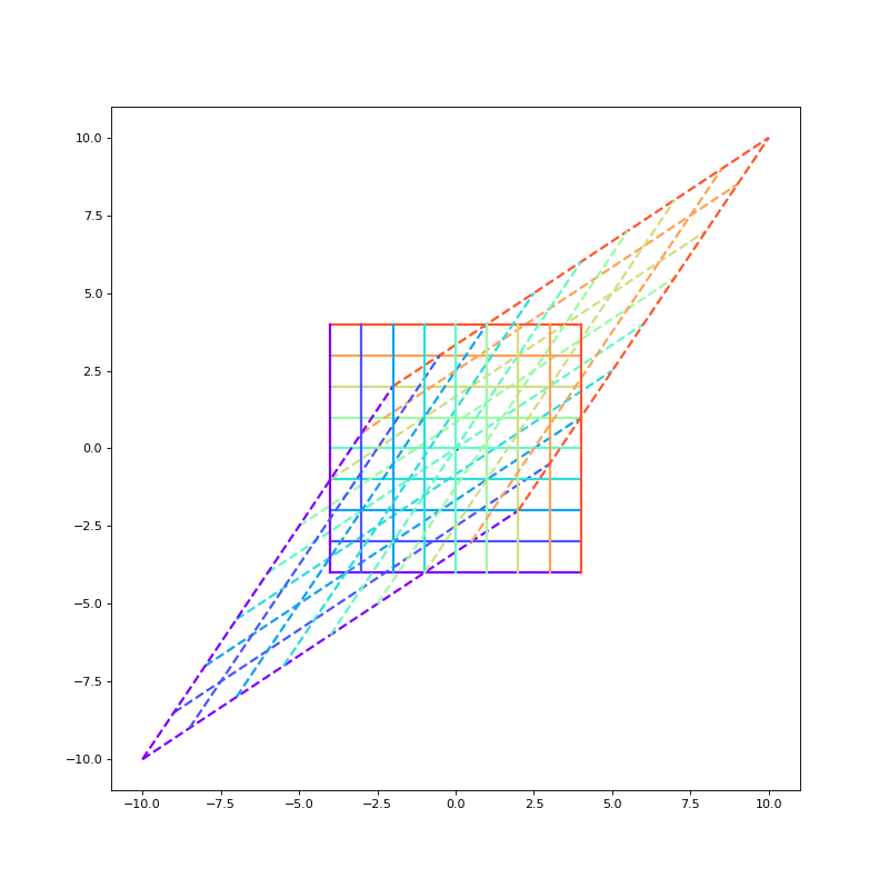위 그래프는 행렬 A에 의해서 정의역의 공간(실선으로 표시한 정사각형)이 대각선 방향으로 길쭉한 평행사변형(점선으로 표시한 평행사변형)으로 변하게 된다는 것을 보여주고 있습니다. 일반적으로 행렬곱(즉, 선형변환)에 의해서 정의역의 정사각형은 치역의 평행사변형으로 변환됩니다. 위 그림에서 정의역의 정사각형의 각 변은 축과 평행한 방향입니다.