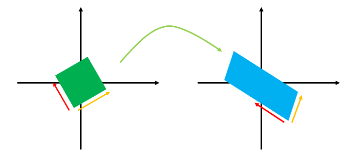 간단히 표시하면 위와 같습니다. 변환된 평행사변형(파란색)은 매우 일반적인 평행사변형 모양이며, 각 변의 방향(오렌지색, 붉은색 화살표) 역시 매우 일반적인 방향을 가리킵니다.
