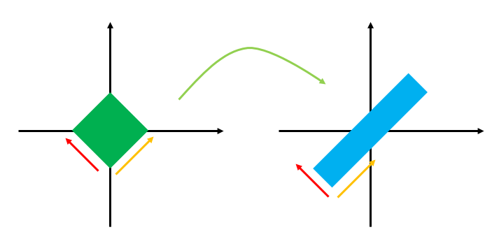 앞서서 보았던 경우에는 변환된 평행사변형이 마름모 모양이었는데, 이는 변환의 대상이 되는 정사각형의 각 변이 축의 방향과 나란했기 때문에 그렇게 된 것 입니다.