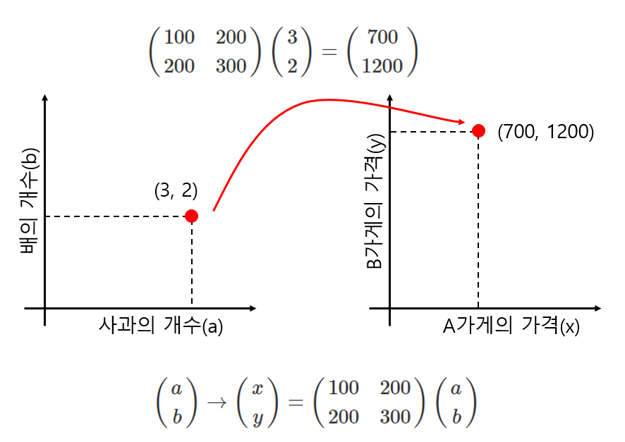 가 되고, 이를 일반화 하여 각 가게의 과일 가격을 $ \begin{pmatrix}100&200\\200&300\end{pmatrix} $ , 사려고 하는 과일의 숫자를 $(a,b)^T$, 최종 가격을 $(x,y)^T$ 로 나타낸다면,