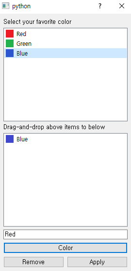 추가적으로 리스트 위젯의 아이템의 텍스트, 즉 위 예시에서는 "Red", "Green", "Blue"라는 문구, 를 QLineEdit()이나 QPushButton()으로 드래그-앤-드롭 하는 것을 만들어 보도록 하겠습니다. 위에서 한 것과 같이 리스트에서 리스트로 아이템을 옮길 수 도 있지만, 리스트에서 LineEdit으로 아이템을 옮길 수 도 있습니다. 예를들면 위 예시 UI의 LineEdit에 색상을 영어로 타이핑을 해야하는데, 사람이 타이핑을 하는 경우 어떤 값을 입력해야 할지 모르거나, 입력하면서 오타를 칠 수 있기 때문에, 미리 예시 아이템을 만들어 놓고 그것을 드래그-앤-드롭을 하여 편히 입력하는 것 입니다.