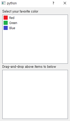 아래쪽에 있는 두 번째 QListWidget()인 self.list_favorite은 그냥 빈 리스트입니다. 위 리스트의 아이템을 이 리스트로 드래그-앤-드롭하여 리스트를 채울 예정입니다.