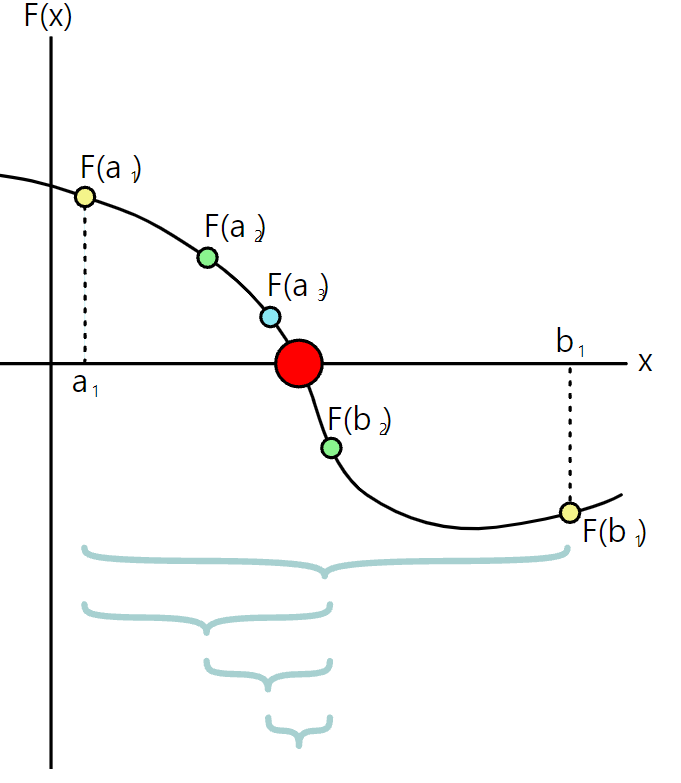 이분법은 위 그림 하나로 설명이 될 것 같습니다. 연속함수 $F(x)$의 $F(x) = 0$의 해를 찾고 있습니다. $F(x)$는 해 주변에서 위와 같은 개형을 갖게 될 것 입니다. 만일 $F(a_1) \gt 0, F(b_1) \lt 0$ 이라면, $F(x)$의 연속성에 의해서 반드시 구간 $[a_1, b_1]$에 적어도 하나 이상의 해가 존재하게 됩니다. 이 구간을 점점 좁혀가면서 해를 정확하게 찾는것이 이분벙 방법의 핵심인데요, $b_2 = \frac{a_1 + b_1}{2}$에 대해서 함수값 $F(b_2)$를 구합니다. 만일 이 값이 음수라면, 해는 $[a_1, b_2]$ 구간에 있는 것이고, 이 값이 양수라면, 해는 $[b_2, b_1$ 구간에 있는 것이 됩니다. 이렇게 한 번 과정을 거치게 되면 해가 존재하는 구간의 크기는 $1/2$로 줄어들게 됩니다. 이 과정을 $n$ 번 반복한다면, 해가 존재해야 하는 구간의 크기는 $\frac{1}{2^n}$ 으로 줄어들게 되고, $n$이 큰 수가 되면 해가 존재하는 구간이 거의 0에 가깝기 때문에 그 구간의 평균값이 해의 값이라고 근사할 수 있습니다. 이 때 근사의 에러는 $\frac{1}{2^{n+1}}$ 크기 정도가 되니, $n$을 10으로 한다면 대략 $0.001$의 오차로 해를 구할 수 있습니다. 위에서 모든 $E$에 대해서 계산한 것에 비해서 정확도가 훨씬 증가하고 계산량을 훨씬 감소합니다.