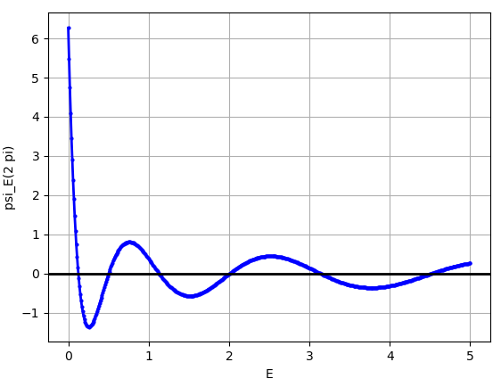 이와 같은 방식으로 계속 해서 $E$를 증가시키면서 슈팅에 성공하는 $E$를 찾으면 됩니다. 매번 위와 같은 그래프를 그리는 것은 다소 귀찮으니, $E$ vs $\psi_{E}(2\pi)$ 를 그리고 이 그래프와 $x$과의 교점, 즉 $\psi_{E}(2\pi) = 0$를 만족하는 $E$를 찾으면 됩니다.