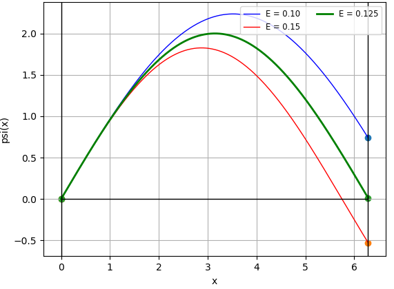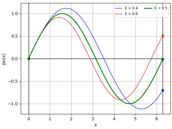 $E = 0.4, 0.5, 0.6$ 에 대한 $\psi_{E=0.4}(x), \psi_{E=0.5}(x), \psi_{E=0.6}(x)$을 차레로 구한 것 입니다. $E = 0.5$에서 정확히 슈팅에 성공(즉, $\psi_{E=0.5}(2\pi) = 0$) 하였습니다. 따라서 첫 번째 여기 상태의 에너지는 $E_1 = 0.5$가 됩니다.