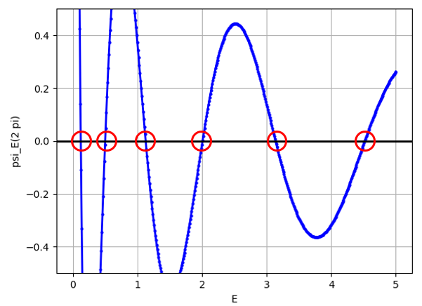 와 같고, 여기서 붉은색으로 동그라미 친 값이 $\psi_E(2\pi) = 0$ 을 만족시키는 $E$값이 됩니다. 그 값은