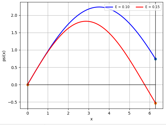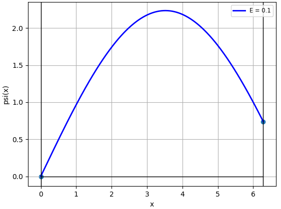 우선 테스트로 $E=0.1$에 대한 $\psi(x)$를 구하면 위와 같습니다. 편의상 이 파동함수를 $\psi_{E=0.1}(x)$라고 표시하겠습니다. 그래프에서 볼 수 있는 것과 같이 $\psi_{E=0.1}(2\pi)$값은 $0$보다 한참이나 큽니다. 따라서 $E = 0.1$은 고유값이 아닙니다. 당연히 $\psi_{E=0.1}(x)$ 역시 슈뢰딩거 방정식의 해가 아닙니다.