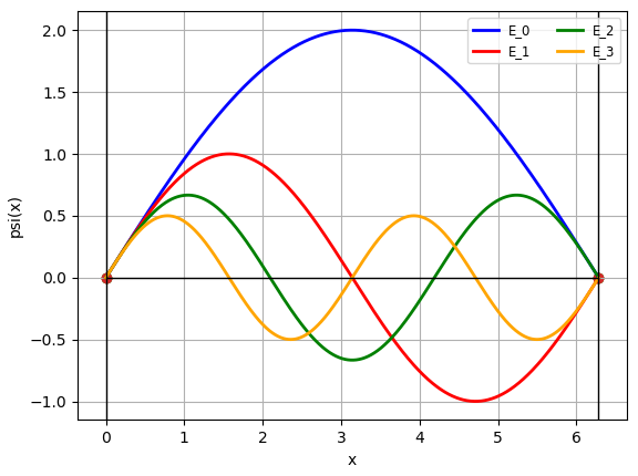 위와 같이 $E = 0.125 = \frac{1}{8}$에서 정확히 $\psi_{E=0.125}(2\pi) = 0$가 됨을 얻을 수 있습니다. 즉 이 문제의 고유값은 $E_0 = 0.125$, 이에 대응되는 고유 함수는 $\psi_0(x) = \psi_{E=0.125}(x)$를 구했습니다. 여기서 $E$와 $\psi(x)$의 아래첨자 $_0$은 그라운드 상태를 나타냅니다.