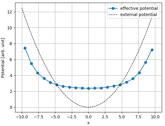 위 시스템의 $n(x)$ 값을 이용하여 위치 $x$에 따른 유효 위치에너지(effective potential)을 정의 할 수 있습니다. 이 시스템의 유효 위치에너지는 이 시스템의 입자의 밀도 $n(x)$와 동일한 밀도를 갖게 하는 외부 힘에 대한 위치에너지 라고 정의 할 수 있습니다. 다시 설명하면, 외부 힘에 의한 위치에너지와 입자간 상호작용에 의한 위치에너지가 모두 있는 시스템을 $A$라고 할 때, 이 시스템의 열평형 상태에서의 입자의 밀도를 $n_A(x)$라고 하겠습니다. 또 다른 시스템은 외부 힘에 의한 위치에너지 $v_{eff}(x)$밖에 없는데, 즉 입자간 상호작용을 하지 않을 때, 이 시스템의 입자의 밀도를 $n_B(x)$라 하겠습니다. 이 때, $n_A(x) = n_B(x)$가 되게 하는 $v_{eff}(x)$를 시스템 $A$의 유효 포텐셜이라고 합니다.