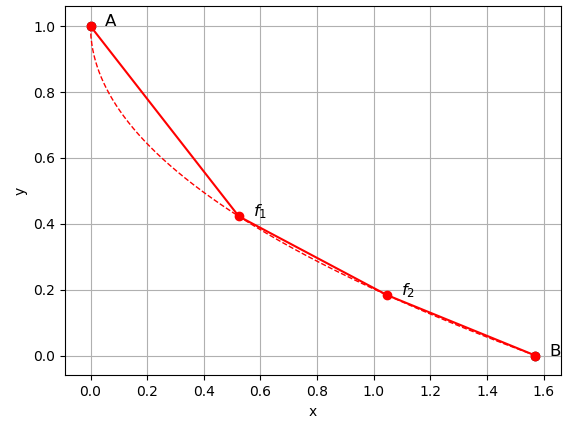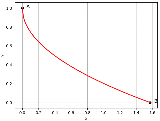 위 그림에서는 구체적으로 시작점 $A = (0, 1)$, 도착점 $B = (\pi/2, 0)$ 로 하였습니다.