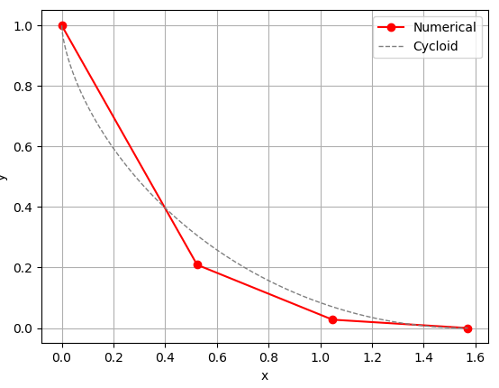 해는 위와 같습니다. 비교를 위해서 해석적인 해인 사이클로이드 곡선을 점선으로 그렸습니다. 붉은색 실선으로 표현한 $N=3$으로 곡선을 분절화한 선분들의 연결이 사이클로이드 곡선과 유사한 모양이 되었습니다.