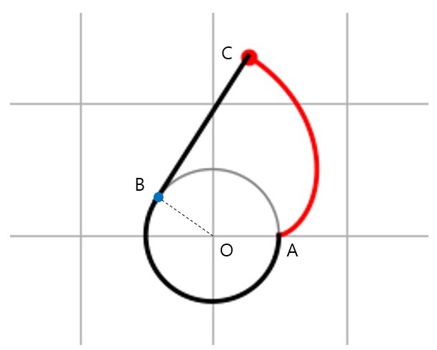 점 $A$에 있던 실의 끝점이 풀려서 점 $C$로 이동하였습니다. 인벌루트 커브는 점 $C$의 자취 입니다. 곡선 $AC$의 길이는 당연히 $AB$와 같고, $C$의 위치는 점 $B$에서 원의 접선 방향입니다. 반대로 설명하면, 원 위의 점 $B$의 접선 중에서 점 $B$의 진행 방향(반 시계 방향)과 반대 방향에 점 $C$가 놓이게 되는데, 선분 $BC$의 길이는 곡선 $AB$의 길이와 같게 됩니다.