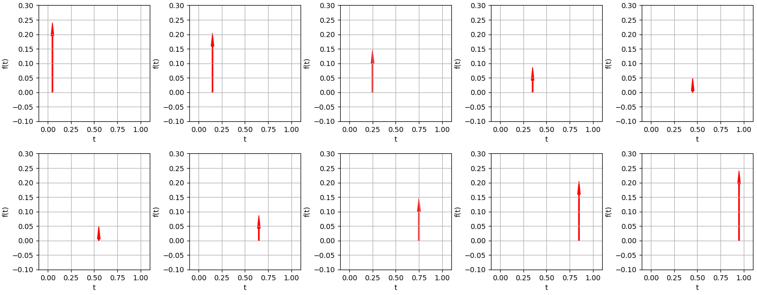 위와 같습니다. 충격이 가해지는 시점을 붉은색 점으로 표시하였고, 그 충격에 의한 진동을 실선 그래프로 표시하였습니다. 위 수식은 이 10개의 그래프를 하나의 그래프로 합치는 것인데, 결과적으로