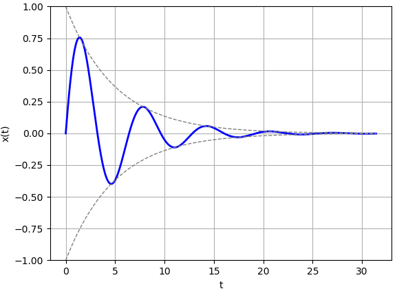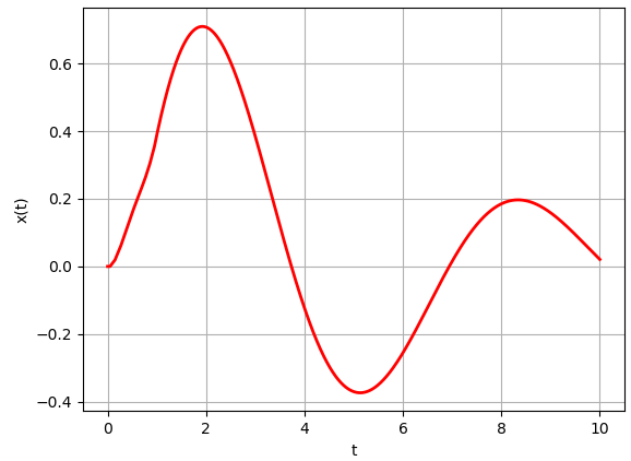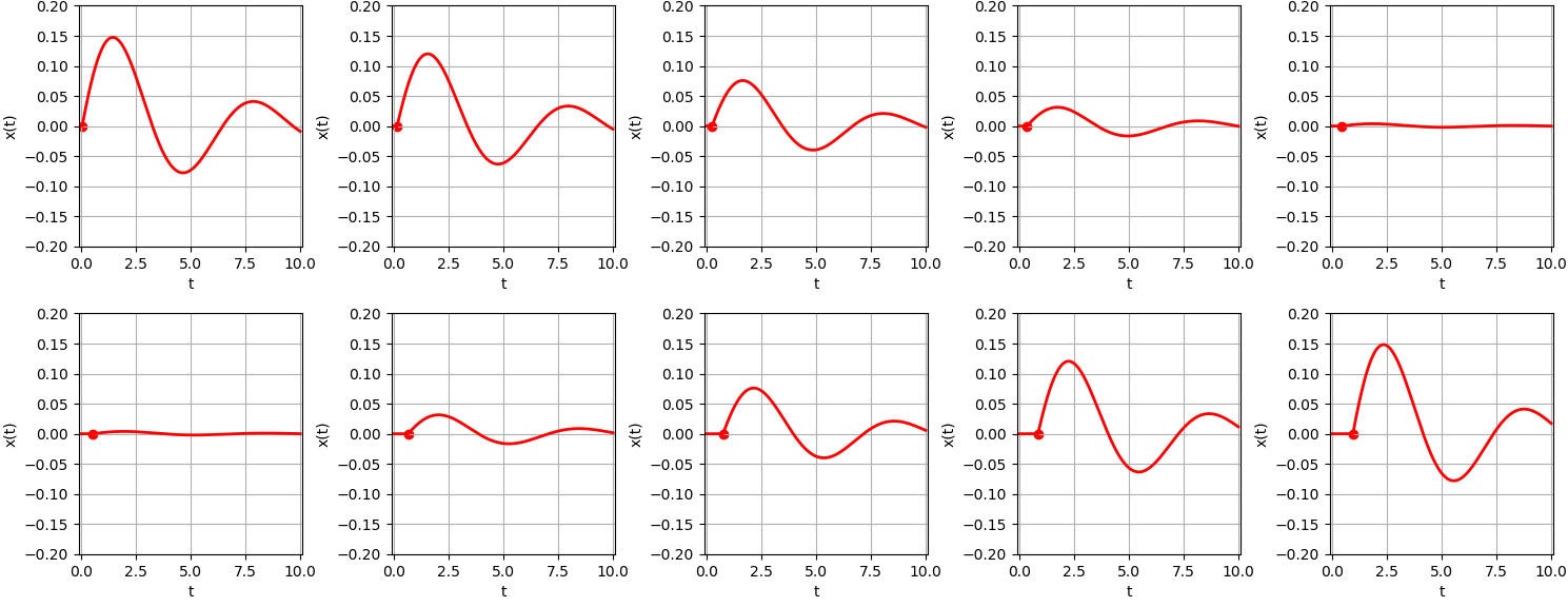 가 됩니다. $t \in [0, 1]$ 구간에서 그래프가 약간 꾸불렁 하는데, 그것은 $[0,1]$ 구간에서 불연속적인 그래프 10개가 합쳐져 있기 때문입니다. $t \gt 1$ 구간에서는 부드러운 감쇄하는 사인 함수 처럼 보이는데, $t \gt 1$에서는 아무런 외력이 작용하지 않았고, $t \lt 1$ 동안 가해진 충격력에 의해서 얻어진 운동량(속도)이 가해진 단순한 감쇄 진동자 운동이 됩니다.