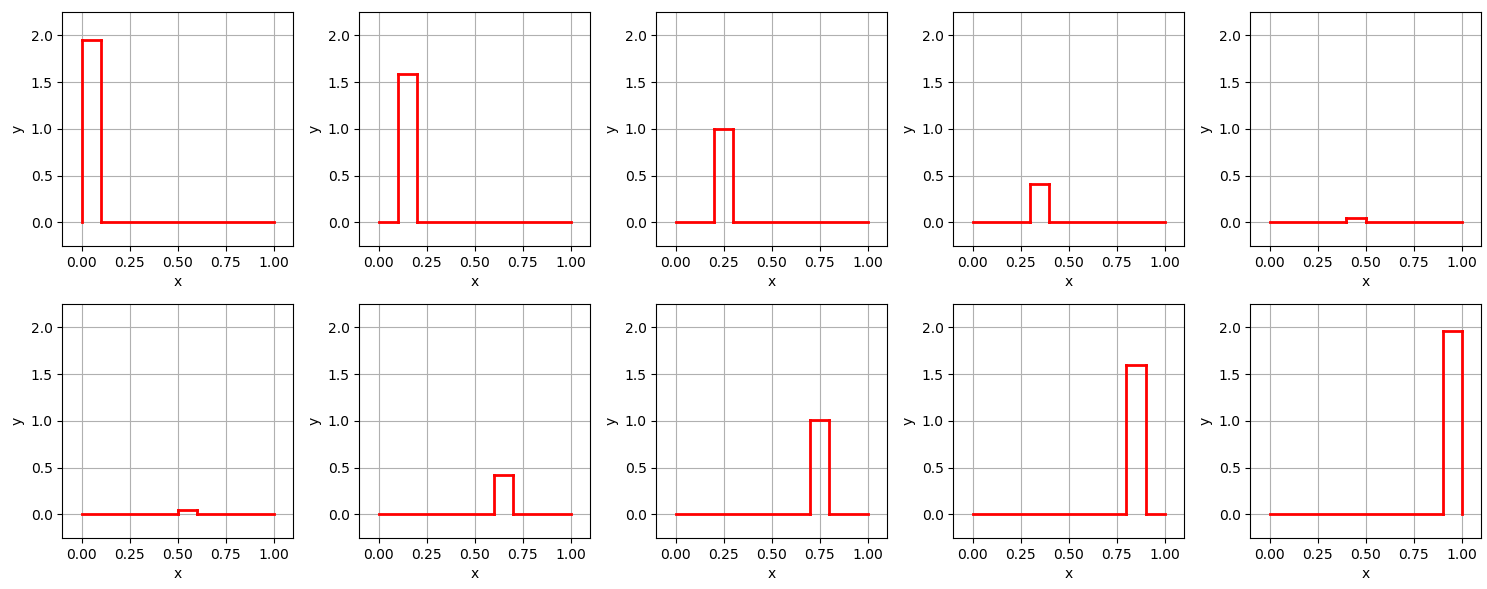 위 그래프에 보이는 10개의 그래프를 모두 더 하는 것 입니다. 위 그래프는 각 $ c_n \delta_{\frac{1}{N}}\big(x- (\frac{1}{N}n+\frac{1}{2N})\big)$ 를 의미 합니다. 위 예시에서는 $N=10$으로 작고 유한한 값이었기 때문에, $f(x)$와 $f_{N}(x)$의 차이가 크지만, 만일 $N\rightarrow \infty$가 된다면 $f(x)$와 $f_{N}(x)$의 차이가 없어지게 되서, $f(x) = f_{\infty}(x)$가 될 것이라고 생각할 수 있습니다. 이 같은 방법은 구분구적법이나 유한요소 해석법에서 항상 취하는 근사와 극한 입니다.