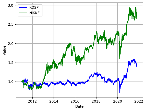 한국 주식 시장과 일본 주식 시장은 관련이 있을까요? 코스피 지수와 일본 니케이 지수(Nikkei 225) 와의 상관 관계를 동일한 방식으로 분석해 보겠습니다.