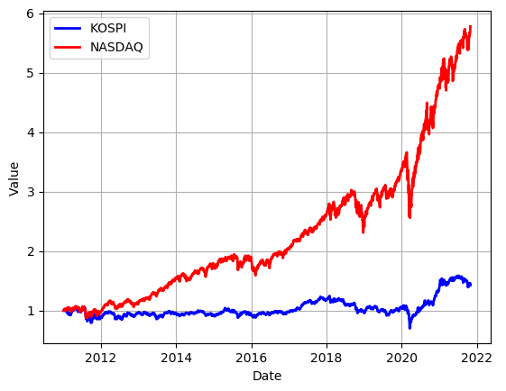 위 그래프는 관심 기간 동안 나스닥과 코스피 주가 지수 입니다. 2011.01.01의 지수를 1.0 으로 정규화 하였습니다. 위 그래프에서 볼 수 있듯, 나스닥은 이 기간 동안 몇 번의 등락 (미중 무역 분쟁, 코로나 팬더믹)이 있긴 했지만, 지속적으로 전고점을 돌파하며 우상향 했습니다. 그에 반해... 코스피는 2011년 부터 2017년까지 긴 박스권을 형성했습니다. 2017년 부터 반도체 호조세 덕택에 우상향 했지만, 미중 무역 분쟁으로 상승분을 모두 반납했고, 코로나 팬더믹을 겪으면서 상승하였지만, 다시 하락하는 분위기 입니다.
