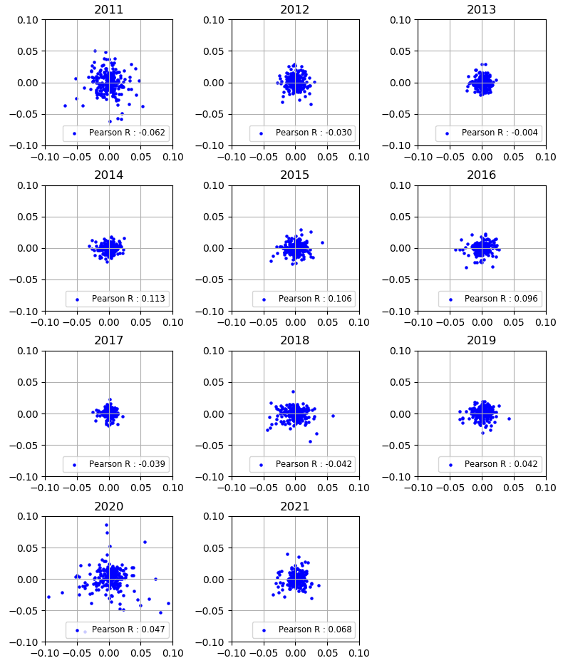 년도 별 상관 계수의 유의미한 차이는 없습니다. 상관 계수가 가장 컸던 해는 2014년인데, 이때의 상관 계수 0.11 (11%) 역시 큰 값은 아닙니다.