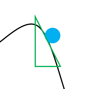 위 그림은 곡선 위에 입자가 있는 곳을 확대한 모습입니다. 입자는 곡선 상에 존재하지만, 국소적으로 보면 녹색 삼각형으로 그린 것과 같이 빗면 위에 있다고 볼 수 있습니다. 따라서 매우 짧은 시간, 매우 짧은 거리 동안에는 입자는 곡선이 아닌 직선 상의 운동을 하게 되고, 입자의 운동 방정식은 빗면 위를 움직이는 입자의 운동 방정식이 됩니다.
