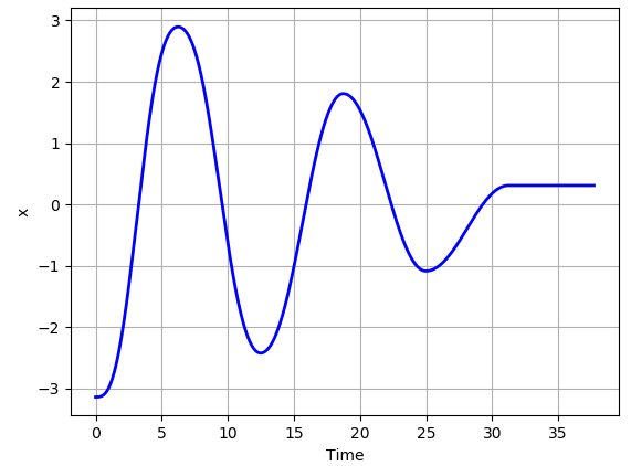 시간에 따른 입자의 $x$축 좌표를 그래프로 그리면 위와 같습니다. 앞서 언급한바와 같이 초기 위치는 높이가 $2$인 곳인데, 이 곳의 $x$좌표는 $-\pi$입니다. 이 시뮬레이션의 물리 상수 세팅에서는 2번 왕복 운동을 한 뒤, 최저점 근처에서 멈춰지게 됩니다.