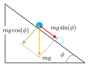 빗면에서 입자의 움직임은 물리학을 처음 배우는 고등학교 시절에 배우게 됩니다. 빗면에 입자가 놓여 있으면 거의 본능적으로 위 그림과 같이 중력(노란색으로 표시)를 빗면 방향의 힘(붉은색으로 표시)과 빗면에 수직한 힘(연두색으로 표시)으로 분해하게 됩니다. 빗면의 기울기 각도를 $\phi$라고 할 때, 빗면 방향으로 가해지는 힘의 크기는 빗면에서 내려 가는 방향으로 $mg \sin (\phi)$가 됩니다. 빗면의 한 기준점에서 입자가 내려간 거리를 $s$라고 한다면, 운동 방정식은