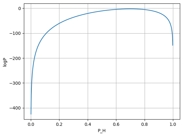 이 확률은 매우 큰 숫자 $\frac{100!}{30! \cdot 70!}$와 매우 작은 숫자 $P_H^{70} \cdot (1-P_H)^{30}$가 곱해진 숫자이기에 이 확률을 그대로 다루는 것은 조금 불편합니다. 따라서 이 숫자에 로그$\log$를 취하곤 하는데, 로그 함수는 단조 증가 함수로 인수의 순서(대소 관계)와 로그를 취한 함수의 순서(대소 관계)가 보존된다는 장점이 있습니다. 로그 확률(확률에 로그를 취한 값)은